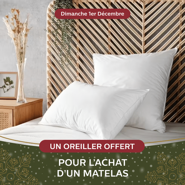 *Un oreiller MEI offert, pour l'achat d'un matelas d'une valeur minimum de 300€. Oreiller sensation mémoire de forme en fibre gel, existe en 45x70cm et 65x65cm.