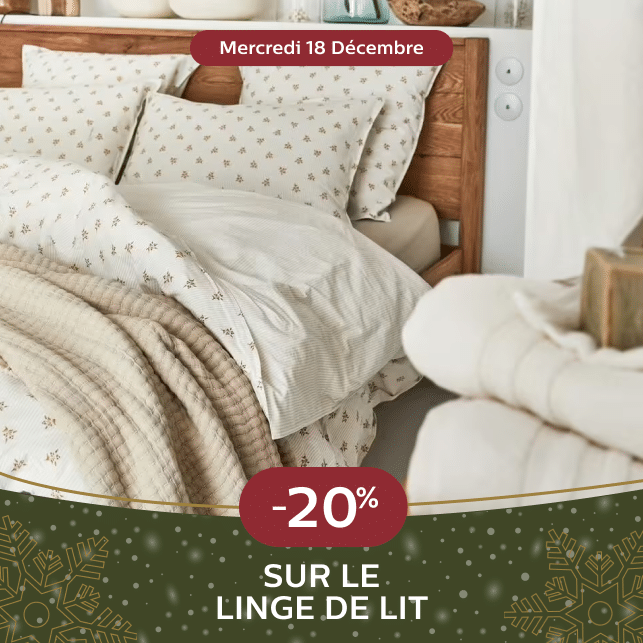 *Offre valable sur tout le linge de lit (drap housse, housse de couette, édredon, couvre-lit) hors promotions en cours et sélection engagée.
